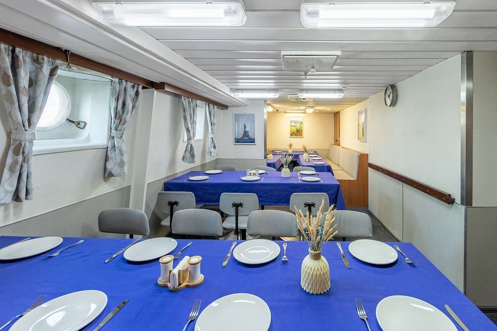 В ресторане со свободной рассадкой завтрак, обед и ужин проходят в формате «шведский стол». На борту работает кофе-станция со свежей выпечкой.