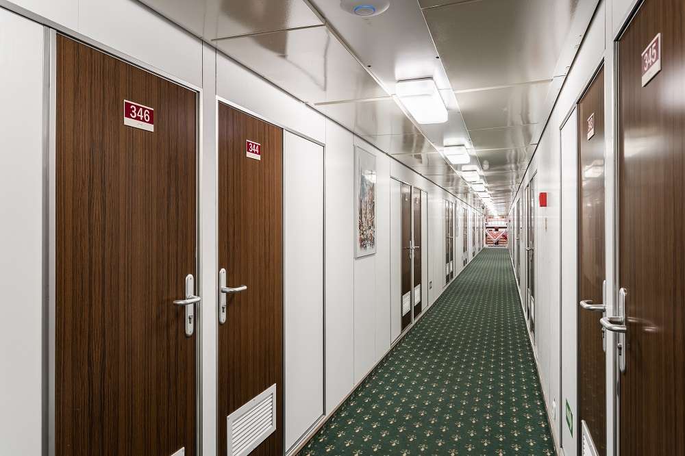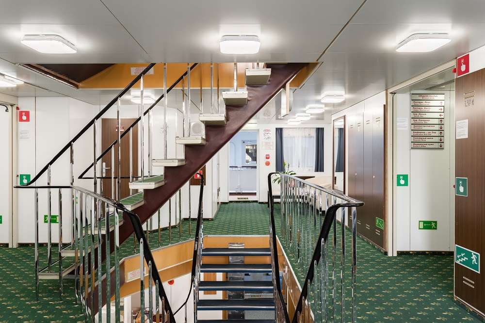 Для проживания туристов на теплоходе представлены каюты разных категорий: 2 каюты класса Люкс, 2 каюты класса Полулюкс, 18 одноместных кают, 46 двухместных кают категории «А», 40 двухместных одноярусных кают, 10 трехместных двухъярусных кают. Во всех каютах: шкаф для одежды, телевизор, холодильник, сейф, фен, радио, душ, санузел, обзорное окно, розетка 220V.